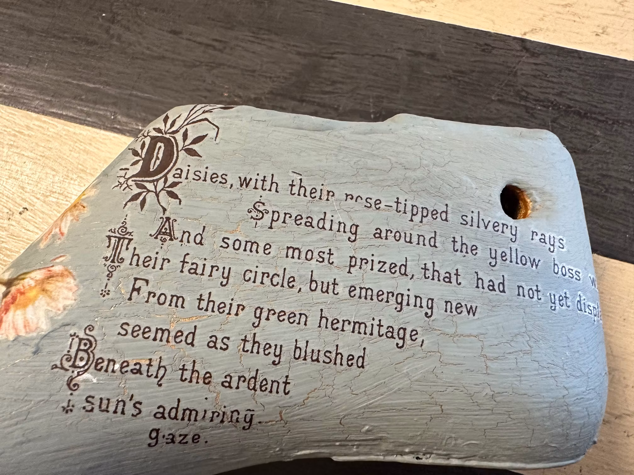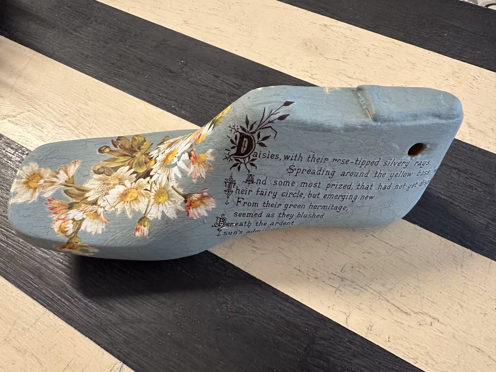 Gammalt skoblock målat med Annie Sloan Chalk Paint Duck Egg Blue.IOD Transfer från Love of Flowers.Under ligger Annie Sloan Traditional Gold metallic och kracke