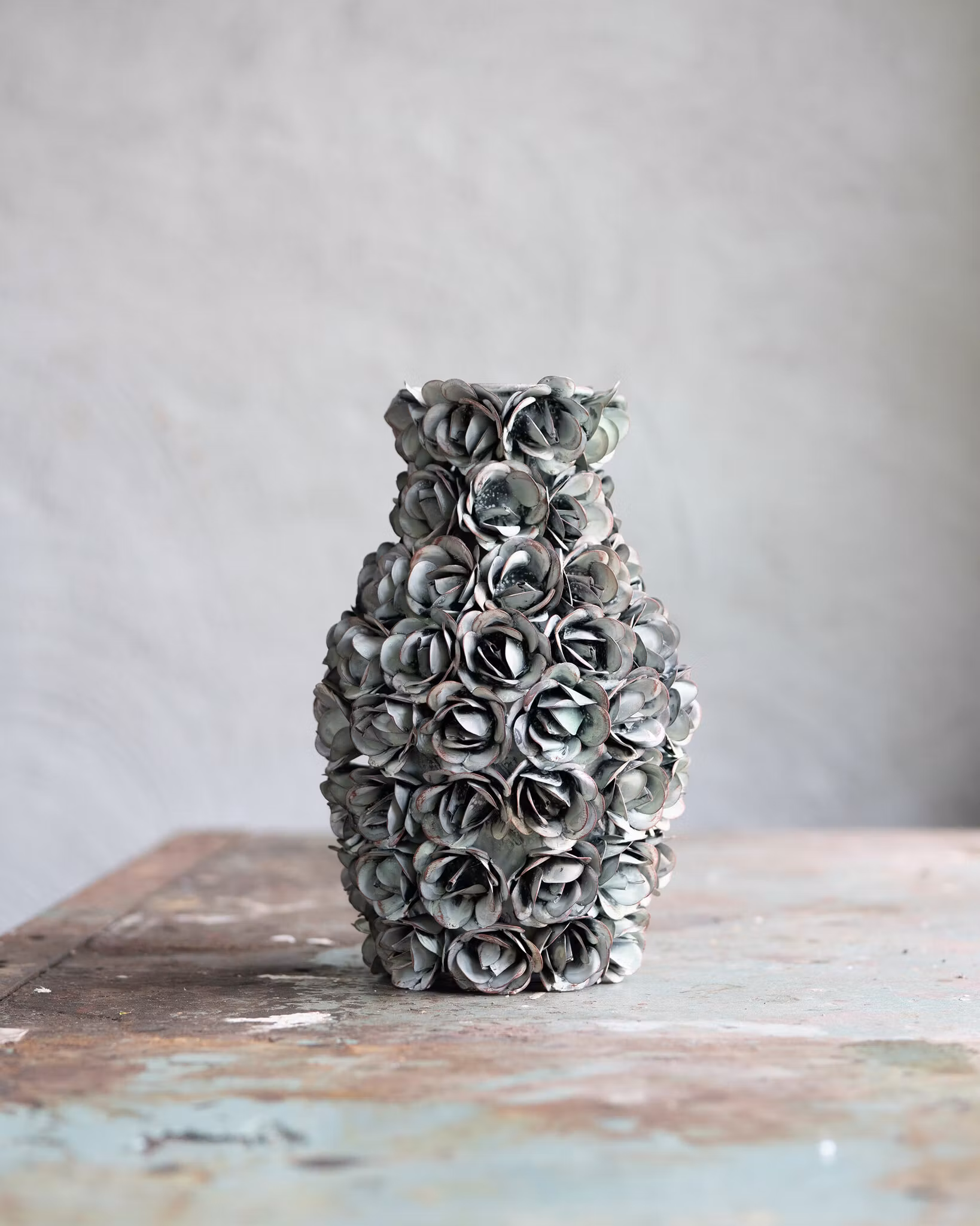 Romantisk Rosvas i grön metall översållad med rosor. Otroligt fin.Vacker som skulptur eller som vas med eller utan blommor.Höjd: 30 cmDiameter: 20 cm