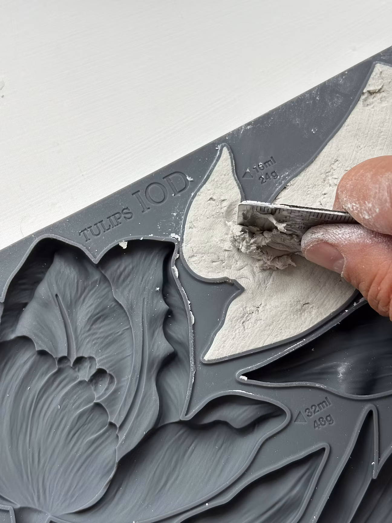 IOD Paper Clay är ett lufttorkande material och en av IOD:s favoriter. Som de flesta sorters lufttorkande lera förekommer en viss krympning, deformering och krackelering, det är naturligt. IOD gillar detta när de ska göra skavda, slipade och vintage liknande jobb. De tar ur leran ur formen när den fortfarande är fuktig och fäster den mot ytan med lämpligt lim så att den formar sig fint. Du kan använda tejp för att den ska sitta kvar medans den torkar.