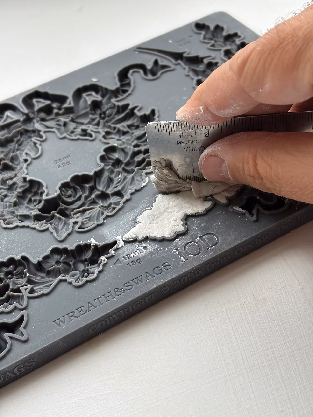 IOD Paper Clay är ett lufttorkande material och en av IOD:s favoriter. Som de flesta sorters lufttorkande lera förekommer en viss krympning, deformering och krackelering, det är naturligt. IOD gillar detta när de ska göra skavda, slipade och vintage liknande jobb. De tar ur leran ur formen när den fortfarande är fuktig och fäster den mot ytan med lämpligt lim så att den formar sig fint. Du kan använda tejp för att den ska sitta kvar medans den torkar.